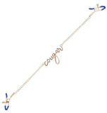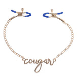 Dare to bare it all and add a touch of thrill to your play with the Cougar Nipple Clamps. These elegant clamps feature a luxurious gold chain with the word "Cougar" written in cursive between them, embodying both style and playfulness. Featuring adjustable tension, these clamps are perfect for exploring new sensations. The sultry blue hue adds a fierce edge, ensuring every moment is as stylish as it is stimulating.