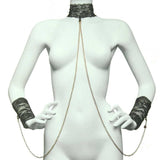 Slip the soft lace collar over your throat, letting long gold metal chains skim your curves as they connect to a matching pair of luscious lace wrist cuffs. The collar and cuffs can absolutely be worn solo, as each piece can be removed from the chain using a simple jewelry style clasp.
