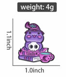 Mystère ensorcelant : L'épinglette présente une grenouille d'un violet enchanteur, habillée d'un chapeau de sorcière. Elle tient un crâne, ce qui ajoute une touche de mystère à son apparence. La grenouille est assise au sommet d'une pile de livres de sorts, créant une ambiance magique.