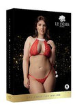 Be a true Snow Angel in this sensationally sexy lingerie set. The beautiful red lace and snowlike white fluffy fabric make this set a glamorous whole. The top boasts a key hole front, and is tied in the back and neck. The bottoms are delicate, crotchless and have side ties making it adjustable in size. The back is fully open. This set is the perfect lingerie for an unforgettable Christmas. It is suitable for sizes 1XL to 3XL. Handwash in cold to warm water, air dry. Do not iron.